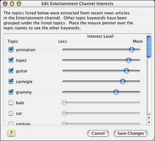 Similarly, the first time a user accesses each channel, the current topic profile is downloaded and the user is prompted to set their initial interest levels in the topics, thus creating a starting point for the topic profile. The word listed as the topic is the token that is the centroid of that cluster. If the user holds the mouse pointer over the topic a tool-tip listing all of the cluster members will be shown.