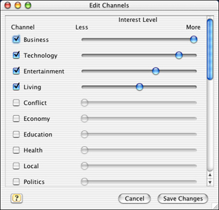 The channel profile is created from the 25 general interest categories derived from the ClariNet newsgroups. Categories in the channel profile do not change, but their order may change depending on the explicit and implicit feedback. The channel profile controls the display and order of the channel tabs within the main interface.