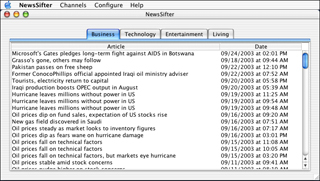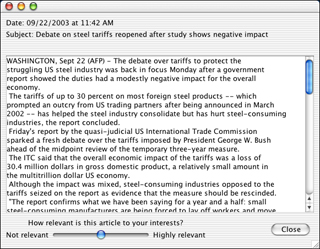 If the user decides they want to read a channel that is not currently displayed, they can either explicitly edit the channel interests through the “Configure” menu or they may select the channel they want to read through the “Channels” menu. When a channel is selected from the “Channels” menu, its interest level is automatically raised above the display threshold and it is added to the tabs. The news articles for the selected channel are classified and sorted based on the topic profile. When an article is double-clicked, it is displayed in a new window.