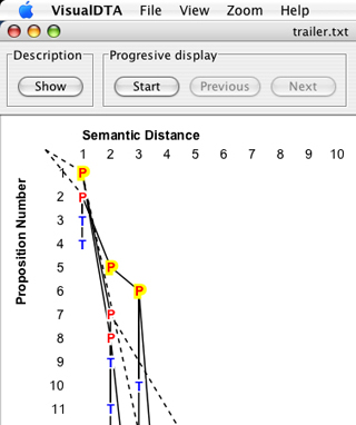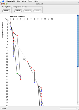 Utilizing VisualDTA to analyze a conversation involves creating a DTA coding. Typically the coding would be created in Microsoft Excel and exported to a TAB delimited file. The coding file is loaded into VisualDTA and the visualization is created and displayed. The display is a tree with the root at the top and the children flowing down and to the right. The passing of time in the conversation is represented going down the y-axis. Moving right on the x-axis represents the semantic distance of how off-topic the proposition is from the previous proposition. The propositions are represented by a letter that indicates the relationship between the current proposition and the proposition to which it is responding, called the move (T for “on-topic”, P for “parallel shift”, E for “explanation”, M for “metatalk”, and B for “break”). Propositions that are in reply to a previous proposition are connected to the proposition to which it is responding using a line. A dotted line is used when the connection is tenuous.