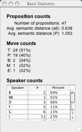 - Basic statistics can be shown that includes the average semantic distance and counts for proposition attributes, such as move type, speaker, and gender.